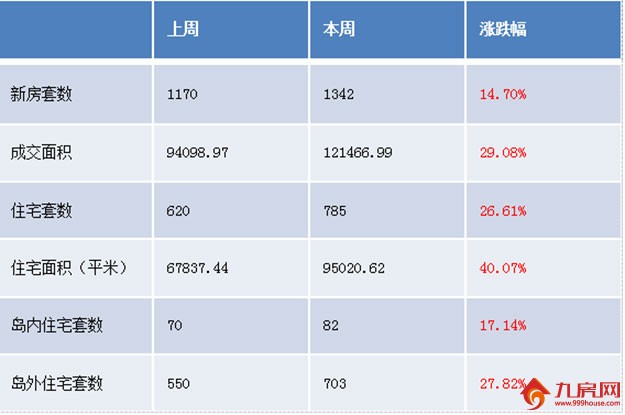 本周(5月18日-5月24日)新房成交套数为1342套,环比上涨14.70%,成交面积121466.99平米。住宅套数成交为785套,签约住宅面积95020.62平米。岛内一手住宅成交82套,环比上涨17.14%,签约面积14143.27平米,占全市一手住宅总成交面积14.88%;岛外一手住宅成交703套,环比上涨27.82%,签约面积80877.35平米,占全市一手住宅总成交面积85.12%。