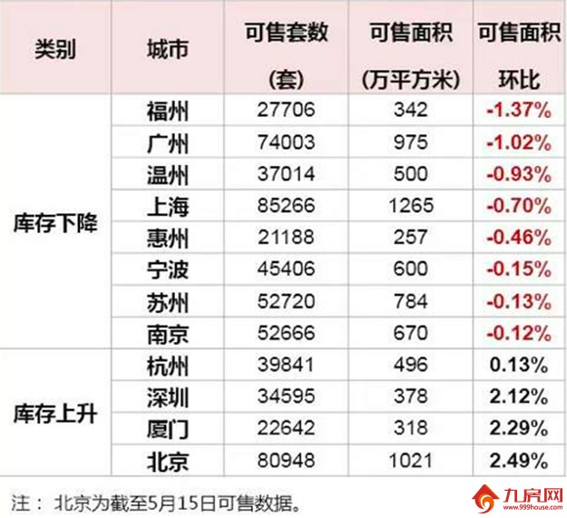截至2015年5月15日主要城市库存情况,住宅存量已有8个城市环比下降了,另外4个城市由于库存基础巨大,而且有了相对较大的新增供应量,所以存量保持上升。厦门可售套数为22642套,可售面积为318万平方米,可售面积环比2.29%