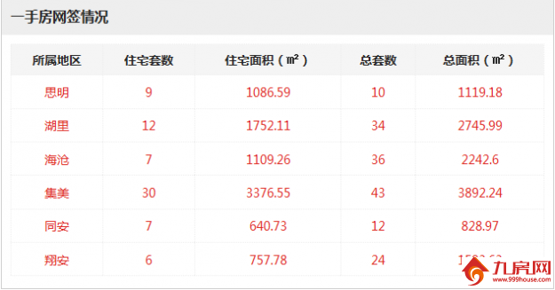 从各区的一手住宅成交数据来看,集美区成交30套,环比上涨50.00%,位居全市一手住宅成交排行榜榜首;湖里区成交12套,位居排行榜第二位;思明区成交9套,位居排行榜第三位。