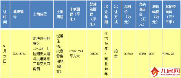 据资料显示,X2015P01地块位于翔安区13-12B 片区翔安大道与洪琳湖东二路交叉口南侧,占地面积8792.744平方米,建筑面积25500平米,规划为城镇住宅,批发零售用地(商业),出让年期为住宅70年/商业40年。拍卖总起价20300万元,起拍楼面价7960.78元/平米。据悉,该地块可单独竞买,也可以联合竞买。