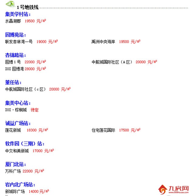 线路走向:会展南路、新华都、岭兜(换乘2号线)、软件园西、释门寺、万达广场、高林(换乘2号线)、上苏、欧厝、彭厝、彭厝北(换乘4号线)、下庙、洪钟大道(换乘3号线)、洪前、洪钟大道、宋坂、翔安区政府、东浦、郑坂村、翔安北路、黎安、萃英公园、洪溪、前垵、董厝、月龙、顶溪头、文体中心、城南。