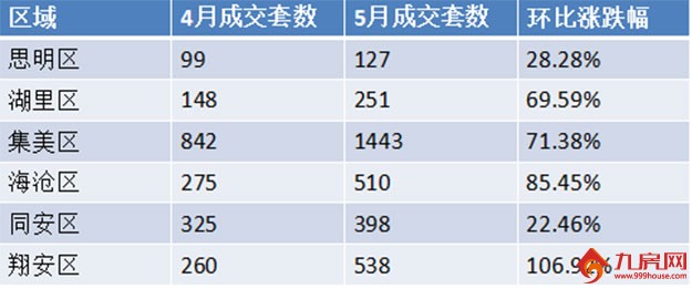 思明区 5月一手住宅成交127套,成交面积17648㎡,比4月多了27套,套数环比上涨27.00%,成交面积环比上涨48.22%。