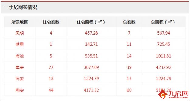 2015年6月6日,厦门全市商品房总共成交144套,一手住宅成交94套,环比上涨28.24%。思明区4套,湖里区1套,海沧区5套,集美区27套,同安区13套,翔安区44套。