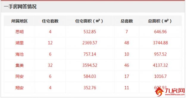 从各区的一手住宅成交数据来看,集美区成交32套,位居全市一手住宅成交排行榜榜首;湖里区成交12套,位居排行榜第二位;海沧区和同安区均成交6套,并列位居排行榜第三位。