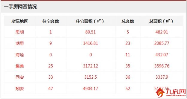 从各区的一手住宅成交数据来看,翔安区成交47套,位居全市一手住宅成交排行榜榜首;同安区成交33套,位居排行榜第二位;集美区成交25套,位居排行榜第三位。