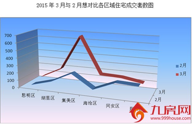 集美区 3月一手住宅成交670套,比2月多了432套,环比上涨181.51%。