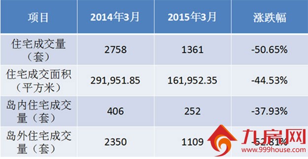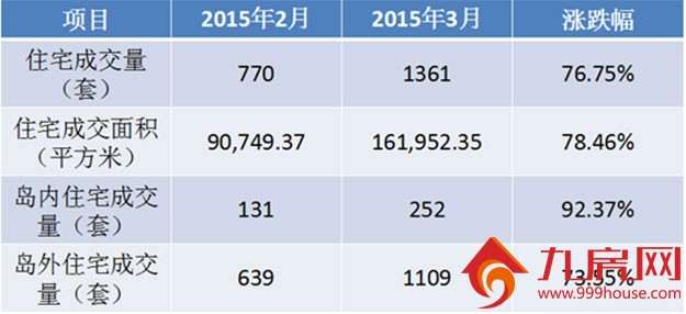 本网根据官方数据统计,2015年3月厦门全市新建商品房成交3012套,其中一手住宅成交1361套,比去年同期的2758套减少1397套,同比下跌50.65%;比2015年2月的770套增加了591套,环比上涨76.75%。一手住宅签约面积161952.35平方米,与2015年2月的90749.37平方米相比,环比上涨78.46%。