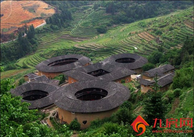 土楼:是利用未经焙烧的按一定比例的沙质黏土和黏质沙土拌合而成的泥土,以夹墙板夯筑而成墙体(少数以土培砖 砌墙)、柱梁等构架全部采用木料的楼屋,简言之,就是以生土版筑墙作为承重系统的任何两层以上的房屋。