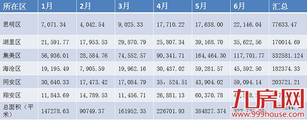 据厦门市国土资源与房产管理局数据显示,2015年上半年,厦门全市住宅共成交11373套,与2014年下半年的11741套相比,环比下跌3.13%;与2014年上半年相比,同比下降20.73%。月均成交约1895套,日均成交约61套。2015年上半年住宅成交面积为1334244.95平米。其中,集美区住宅面积成交量占全市总成交的39.92%,位居全市第一。