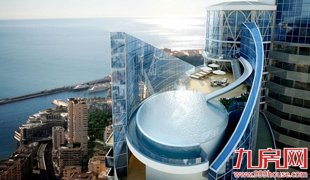 摩纳哥新国宾大厦的空中别墅,位于全球著名的观光度假胜地,此建筑不仅有奢华顶级配备,更有一划水道连接到外部无边界泳池,独树一帜的设计更具话题性。有这样的规格当然价格也不容小觑,光是一个停车位的价格就高于一般美国中等住宅售价的一半。空中别墅的开发商尼可洛•马扎克也表示,像空中别墅这种建筑是让买家买来珍藏的。