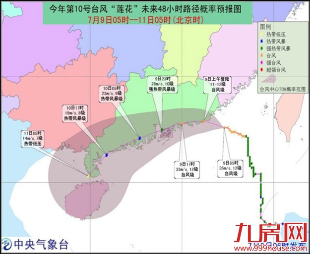 台风“莲花”已于昨天晚上8点钟加强为台风,今天早晨5点钟其中心位于广东省汕头市东南方大约105公里的南海东北部海面上,中心附近最大风力有12级。预计,“莲花” 将以每小时15-20公里的速度向北偏西方向移动,强度将维持或略有减弱,将于今日上午在广东汕头到汕尾一带沿海登陆,登陆强度为强热带风暴级或台风级。登陆后,“莲花”将转向西偏南方向移动,强度逐渐减弱。中央气象台7月9日06时发布台风橙色预警并继续发布暴雨蓝色预警。