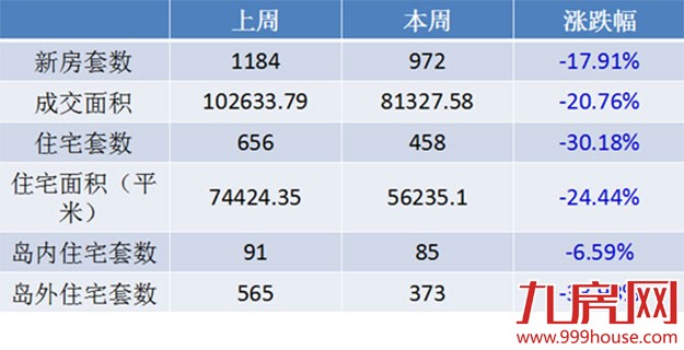 岛内一手住宅成交85套,环比下跌6.59%,签约面积13736.70平米,占全市一手住宅总成交面积24.43%;岛外一手住宅成交373套,环比下跌33.98%,签约面积42498.40平米,占全市一手住宅总成交面积75.57%。