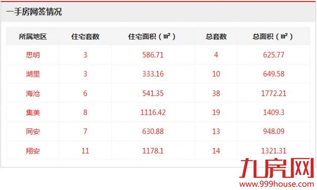 从各区的一手住宅成交数据来看,翔安成交11套,位居全市一手住宅成交排行榜榜首;集美区成交8套,位居排行榜第二位;同安区成交7套,位居排行榜第三位。
