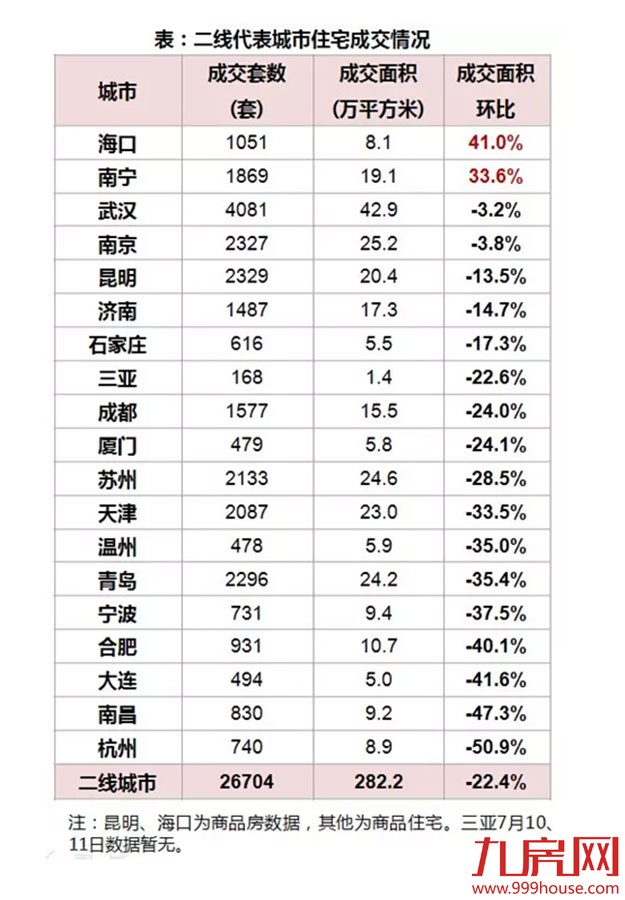 二线城市:7月5日-7月11日19个二线代表城市中仅海口、南宁成交量环比上涨,致使二线代表城市成交总量环比下跌22.4%。其中,杭州跌幅最大,为50.9%,南昌次之环比下降47.3%。厦门7月5日-7月11日成交套数479,成交面积5.8万平方米,成交面积总体下降-24.1%