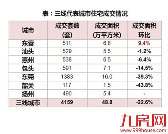 三线城市:6个可比三线代表城市成交总量较前一周下降22.6%。其中,韶关降幅最大,为43.8%,仅东营较前一周有所上涨,涨幅为9.4%。