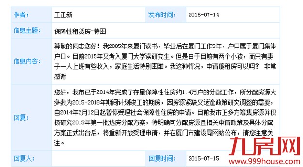近日,有网友向厦门市建设局咨询保障性租赁房的相关申请条件。市建设局表示,目前厦门市已于2014年完成了存量保障性住房约1.4万户的分配工作,自2014年2月12日起已经暂停受理社会保障性住房的申请。不过目前我市正多方筹集房源并积极研究2015年第一批选房分配方案,待明确可分配房源且相关申请政策及具体分配方案正式出台后,将重新开始受理申请。