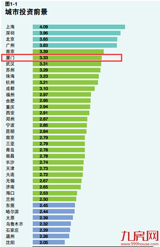 此外,在开发前景方面,四强城市的排名有所变化:2015年,深圳取代上海跻身第一位,成为上海连续两年称霸榜首的终结者;北京则超过南京,排名第四。榜单排名前五的城市分别为:深圳、上海、广州、北京、南京。而厦门同样处于全国第6的位置,分数值为3.35。
