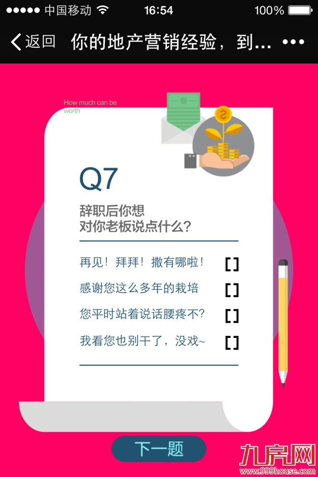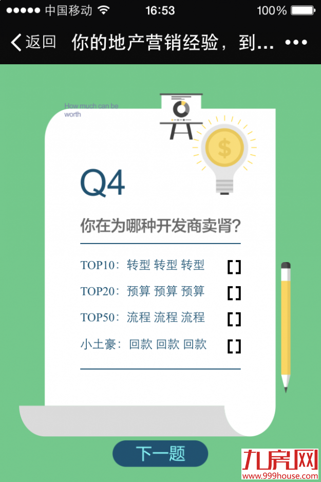 今天朋友圈被一则测试刷屏了,从包括心理年龄、内心独白和星座属相等各种你意向不到的角度对你的地产营销经验进行测试,让你知道你的真实身价值多少钱。测试上线不到1小时,各相关人士纷纷加入测试,当中更引发了众多名人大咖、路人甲乙的疯狂刷屏。
