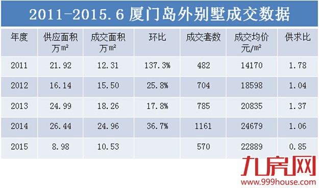 岛外别墅在全市商品住宅市场中的占比从2013年的4.1%增长到今年上半年的8%,供求比更是从2011年的1.78下降到今年上半年的0.85,近5年厦门别墅市场成交大幅持续增长,岛外别墅表现尤为抢眼,创造了改善型置业新的增长点。