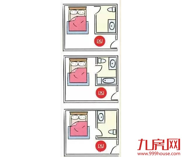 房间里的厕所对到床,情况比房门对到厕所严重,对到头,会头痛、思考时不能集中,住久了会产生肿瘤、中风等;对到腰,会腰酸、心脏无力,住久了会产生糖尿病、心脏病……