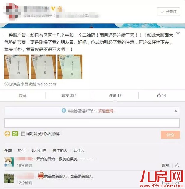 厦门日报一篇“最近的厦门都被它刷屏了”被朋友圈火速转发,小编也忍不住点了进去。说实话,不知道是智商低还是情商低,看了两遍,愣是没看懂什么意思。只弄懂一点就是不知道哪个土豪连续三天在日报整版刊登广告,而且广告只有区区十几个字和一个二维码!然后就引起了朋友圈的刷屏以及全国各地的手势模仿秀。