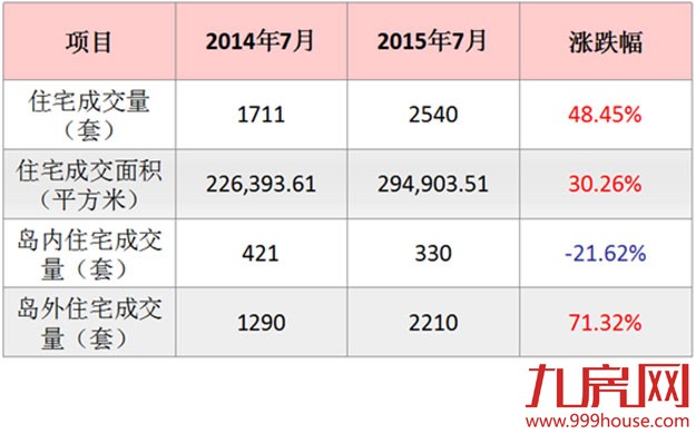 根据官方数据统计,2015年7月厦门全市新建商品房成交4606套,其中一手住宅成交2540套,比去年同期的1711套增加了829套,同比上涨48.45%;比2015年6月的2783套减少了243套,环比下跌8.73%。一手住宅签约面积294903.51平方米,与2015年5月的322735.30平方米相比,环比下跌8.62%。