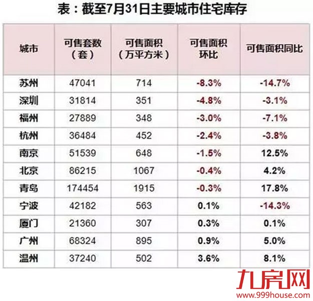 由于上半年去化持续加快,加之本月开发商推盘力度放缓,致使本月库存继续保持下行趋势。截至2015年7月31日,监测的11个城市库存面积环比下降1.23%,同比来看,库存总量上涨2.8%。厦门可售套数为21360套,可售面积为307万平方米,可售环比为0.3%。可售面积同比上涨0.1%。