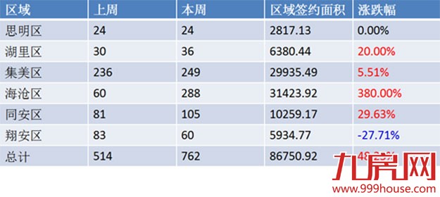 从各区成交情况看,海沧区一手住宅成交288套,环比上涨380%,位居一手住宅成交排行榜首位;集美区成交249套,环比上涨5.51%,位居一手住宅成交排行榜第二位;同安区一手住宅成交105套,环比上涨29.63%,位居一手住宅成交排行榜第三位。