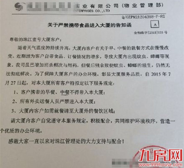 近日,南京某大厦物业贴出告知函,为了防止夏季蚊虫、蟑螂孳生等现象,严禁写字楼工作人员携带食品进入大厦。有人将通知发到微博上,引发了网友的热烈讨论。