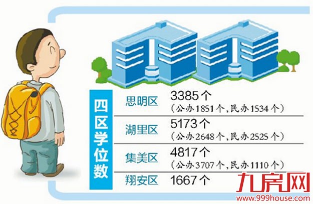 在最引人注目的岛内,思明区提供学位3385个(其中,公办学校1851个,民办学校1534个),湖里区提供学位5173个(其中,公办学校2648个,民办学校2525个)。“压力山大”的集美区总计提供学位4817个(公办学校3707个,民办学校1110个),翔安区提供的应该都是公办学校的学位,总计1667个。截至昨晚11:00记者发稿,海沧区和同安区还未公布学位数。