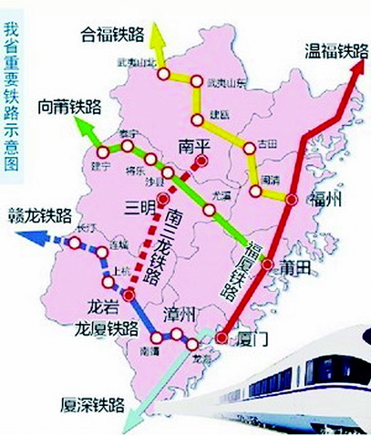 南三龙铁路北起在建的合福铁路南平北站,经沙县、三明、永安、漳平至赣龙铁路龙岩站,新建正线长度246.55公里,设计行车速度200公里/小时,于2013年12月开工建设。