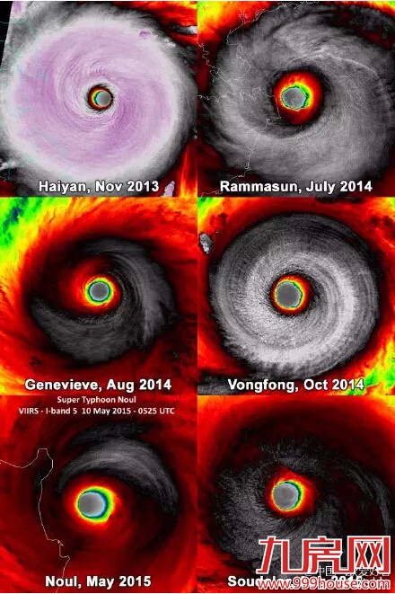 上图是苏迪罗和近几年的超强台风对比,从左到右,从上到下,依次为海燕、威马逊、吉纳维芙、黄蜂、红霞、苏迪罗。大家看出什么端倪了没有?
