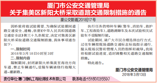 本网从厦门市公安交通管理局获悉,因桥梁荷载试验需要,为确保试验期间道路交通安全,于2018年3月18日0时至3时,对集美区新阳大桥采取道路交通限制。具体事项通告如下: