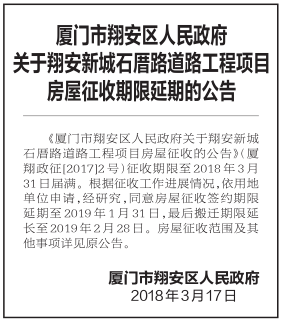 《厦门市翔安区人民政府关于翔安新城石厝路道路工程项目房屋征收的公告》(厦翔政征[2017]2号)征收期限至2018年3月31日届满。根据征收工作进展情况,依用地单位申请,经研究,同意房屋征收签约期限延期至2019年1月31日,最后搬迁期限延长至2019年2月28日。房屋征收范围及其他事项详见原公告。