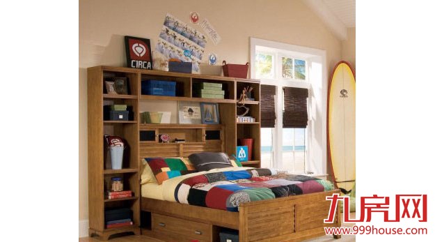小卧室聚财虽然重要,但规划不好,就很容易压抑心情。这间房的床头空间利用相当高效:左右书柜,上方搁板。
