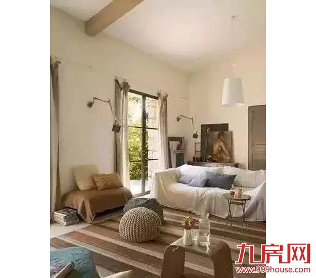 喜欢棉麻木的小伙伴看看这张的搭配,各种细节简直极致!沙发盖布气场足,白色简约吊灯和黑色复古壁灯配的好,大框玻璃门采光充沛,两个圆坐墩调节了空间流线感,整体白色、浅棕、灰蓝三色搭配最唯美,森系偏执狂的福音。