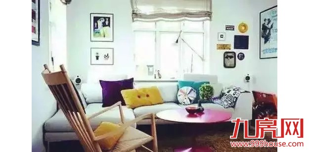 使用白墙、浅灰沙发、质朴的浅灰麻质窗帘。用靠垫、茶几、装饰品等小色块突出不同色彩,缤纷而不杂乱闹心。
