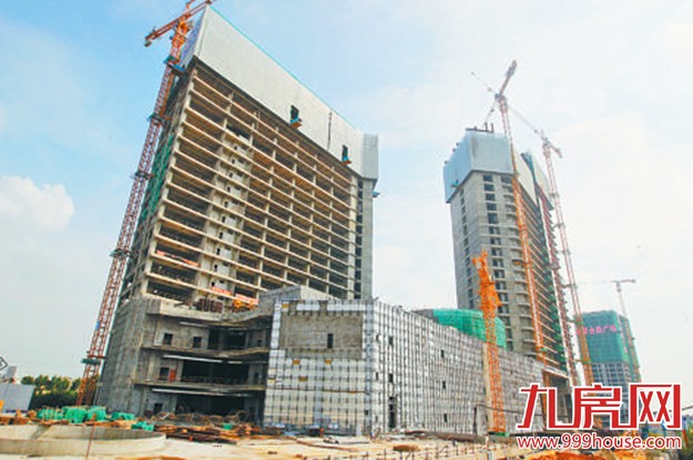 600多名工人正冒着高温奋战在工地现场,有条不紊施工中。两栋写字楼均为30层,目前已建至28层和24层。工人们兵分三路,部分在外墙做幕墙的施工,部分在地下室做安装工作,包括冷水机、消防、排水等,还有一部分工人在裙楼做精装修。
