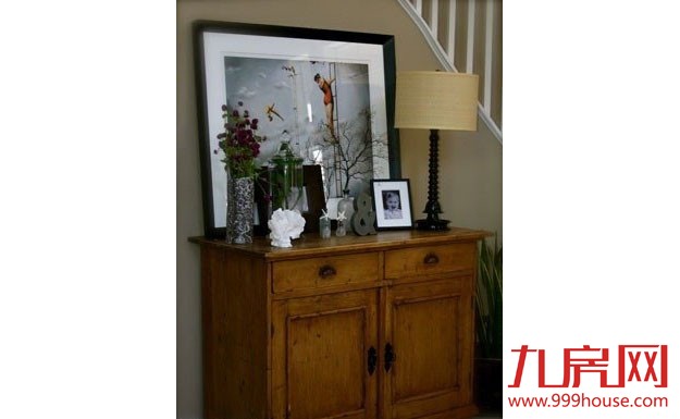 边柜居中一张大比例的照片,四周包围一些小尺寸的装饰品,如此大小比例的对比,更能衬托出大照片的完美视觉效果,小小的角落里也体现了自己与众不同的心思和创意。