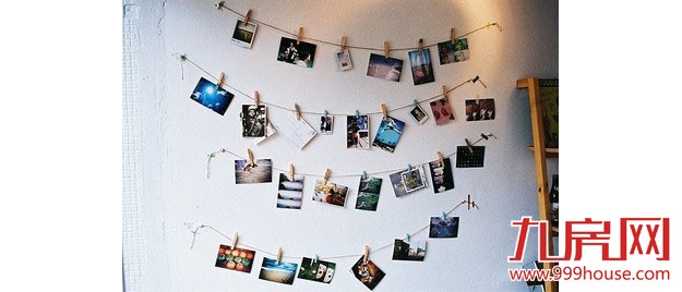 网络语中把照片分享叫“晒”照片,于是我们就可以真的把家里的一张张照片全都“晒”出来。用木夹子把照片固定在钢丝绳上,大小随意错落排列,产生一种动态的美感。