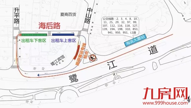 因此中山路口出租车上下客区域将调整:取消原在中山路口的出租车上下客区域,调整为在海后路设立出租车站,并沿道路西侧设置出租车上下客区。
