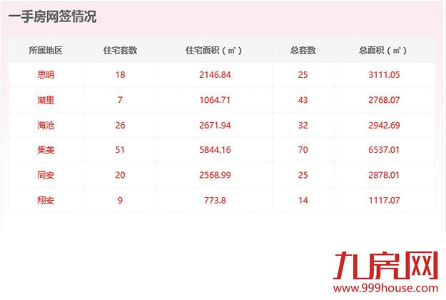 2015年8月21日,厦门全市二手房成交192套,二手房成交住宅套数159套,一手住宅成交131套,环比上涨41.22%。其中,思明区18套,湖里区7套,海沧区26套,集美区51套,同安区20套,翔安区9套。
