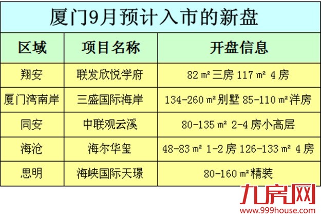 厦门楼市淡季不淡,销量不减,上周(8月17日-23日),厦门新房成交量达到1043套,成交面积98734㎡,这是8月以来成交量连续第三周上涨。市场稳健回暖已毫无疑问,加之央妈再放大招,金九即将到来,9月将迎一波推盘潮。据九房不完全统计,9月厦门将有19盘入市,其中纯新盘有5个。