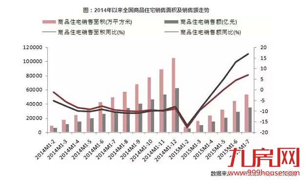 而从全国数据来看,二季度以来全国商品房销售市场持续好转:1-5月起商品住宅面积、金额同比由降转升,1-7月份住宅销售面积53009万平方米,销售额34884亿元,同比分别增长6.9%和16.8%,大大高于办公楼、商业营业用房等其他用途商品房销售增速。