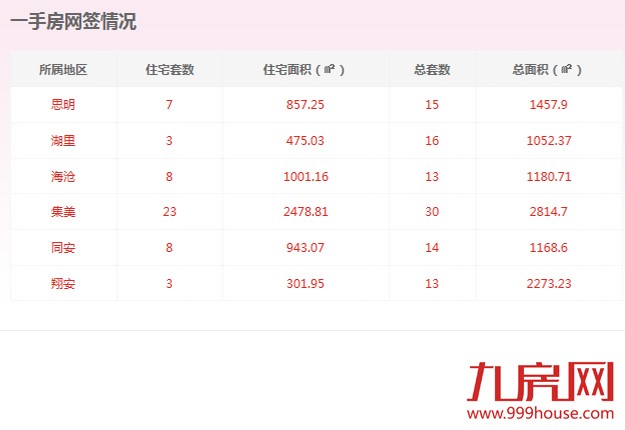 从各区的一手住宅成交数据来看,集美区成交23套,位居全市一手住宅成交排行榜榜首;海沧区和同安区成交8套,位居排行榜第二位;思明区成交7套,位居排行榜第三位。