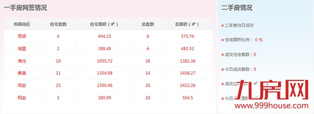 2015年9月5日,厦门全市二手房无成交数据,二手房成交住宅套数无成交数据,一手住宅成交55套,环比上涨5.77%。其中,思明区4套,湖里区2套,海沧区10套,集美区11套,同安区25套,翔安区3套。