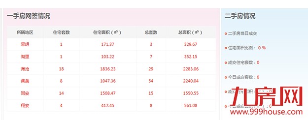 2015年9月12日,全市二手房无成交数据,二手房成交住宅套数无成交数据,一手住宅成交46套,环比下跌45.88%。思明区1套,湖里区1套,海沧区18套,集美区8套,同安区14套,翔安4套。