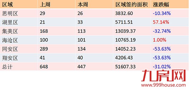 从各区成交情况看,同安区一手住宅成交134套,环比下跌53.63%,再次位居一手住宅成交排行榜首位;集美区成交113套,环比下跌32.74%,位居一手住宅成交排行榜第二位;海沧区一手住宅成交101套,环比上涨1%,位居一手住宅成交排行榜第三位。