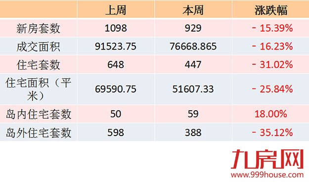 厦门全市商品房成交929套,环比下跌15.39%。全市一手住宅成交447套,环比下跌31.02%,日均成交63套。本周仅湖里区和海沧区环比上涨,其他各区成交均下跌。同时,同安区以134套的周成交量再次位居周排行榜第一。岛内一手住宅成交59套,环比上涨18%,签约面积9544.11平米,占全市一手住宅总成交面积18.49%;岛外一手住宅成交388套,环比下跌35.12%,签约面积42063.22平米,占全市一手住宅总成交面积81.51%。