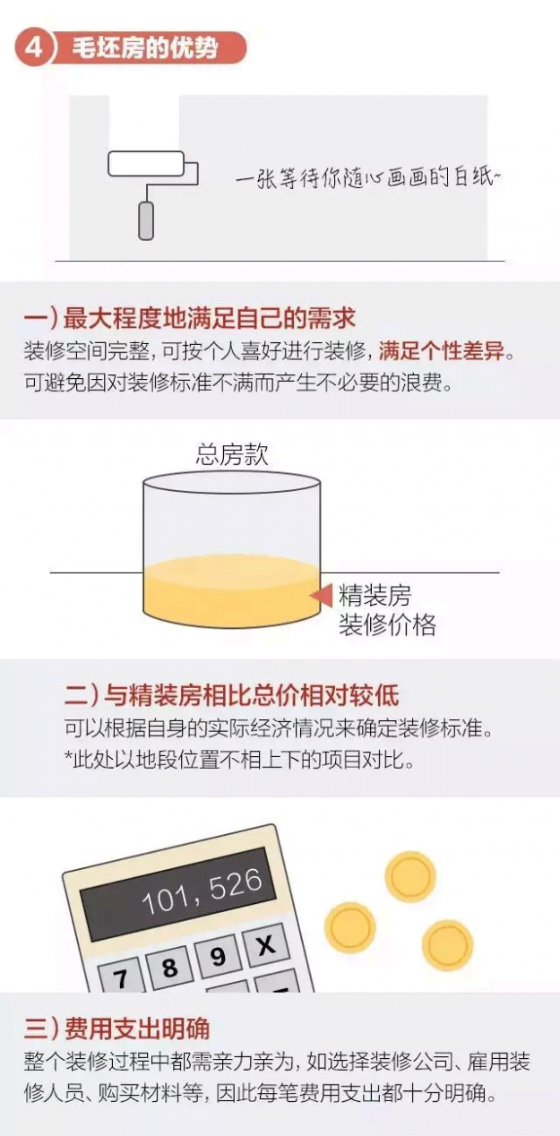 买房到底毛坯房好还是精装修的好?我们知道,毛坯房可以按照自己的意愿选择喜欢的装修风格,有人认为买房是人生中的大事,细到一颗螺丝钉也要自己亲自把关。但在如今追求省时省力的高速时代,精装房日渐成为买房的趋势,但是精装房相对来说较高的价格也让很多人望而却步。精装VS毛坯,自己对号入座吧!